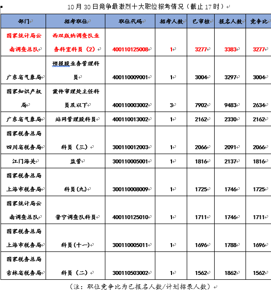 從競爭比來看,已出現25個“千里挑一”職位,過審競爭比均已超過一千,比30日多了1/3,其中北京、雲南、四川各佔5席。華圖專家預測“千人坑”的數量今天還會暴增。其中國家統計局雲南調查總隊西雙版納調查隊業務科室科員(2),繼續領跑競爭比,高達3339:1。記者查詢招考簡章發現,該職位限制條件相對較少,不限政治面貌、不限基層工作經歷、不限服務基層經歷。此外,該崗位的學歷要求為僅限本科,專業為理學、工學。