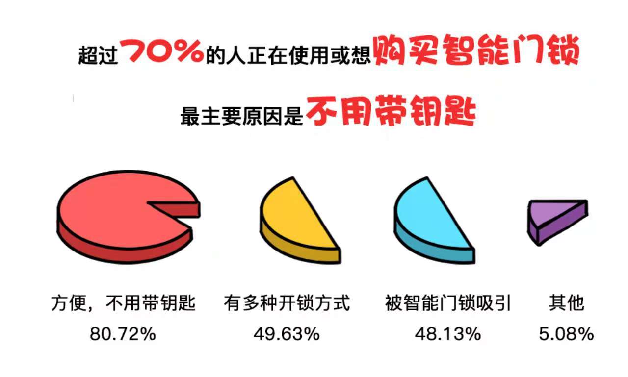 如今,隨着AI、物聯網技術的進步以及指紋識別模塊、藍牙等與硬件融合度的不斷提高,智能門鎖無疑成為最佳選擇。超過70%的人對智能門鎖有購買使用意向,主要原因就是“不用帶鑰匙”。