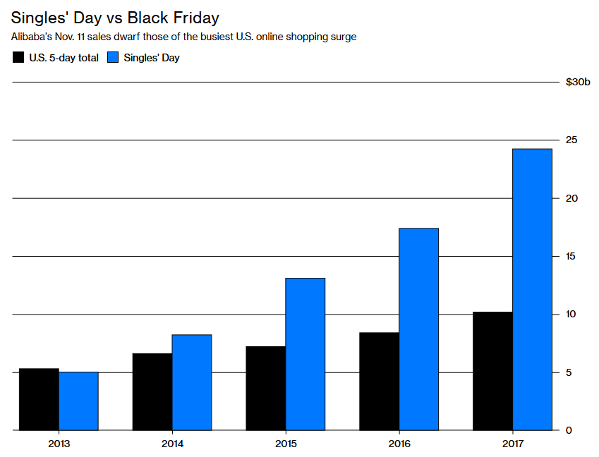 黑色星期五的購物狂潮是美國最大的促銷節點,從感恩節開始直至網絡星期一為止長達5天,而中國的光棍節購物潮僅僅24小時,銷售的貨物量是黑五購物潮的2倍多,而且每年的銷售額都在超過上一年的記錄,去年的銷售額增長了39%達到1682億元(242億元美元),這幾乎與一些較小的歐洲國家全年生產總值相當。