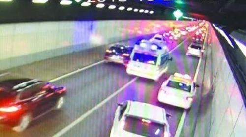 此後,隧道內兩股車道上的所有車輛如同拉鍊一樣,在救護車快要經過時“打開”通道,等待救護車離開後合攏,沒有車搶行,直至救護車離開。