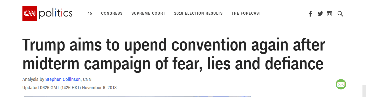 【環球網報道 記者 張飛揚】美國當地時間11月6日,特朗普將迎來第一個總統任期的“期中考”:中期選舉。美國有線電視新聞網 (CNN)6日以《在一次充滿恐懼、謊言和藐視的中期選舉後,特朗普會再次顛覆傳統》為題發表了一篇分析文章。文章批評了特朗普在競選期間的行事風格,並對中期選舉可能的結果進行了預測。