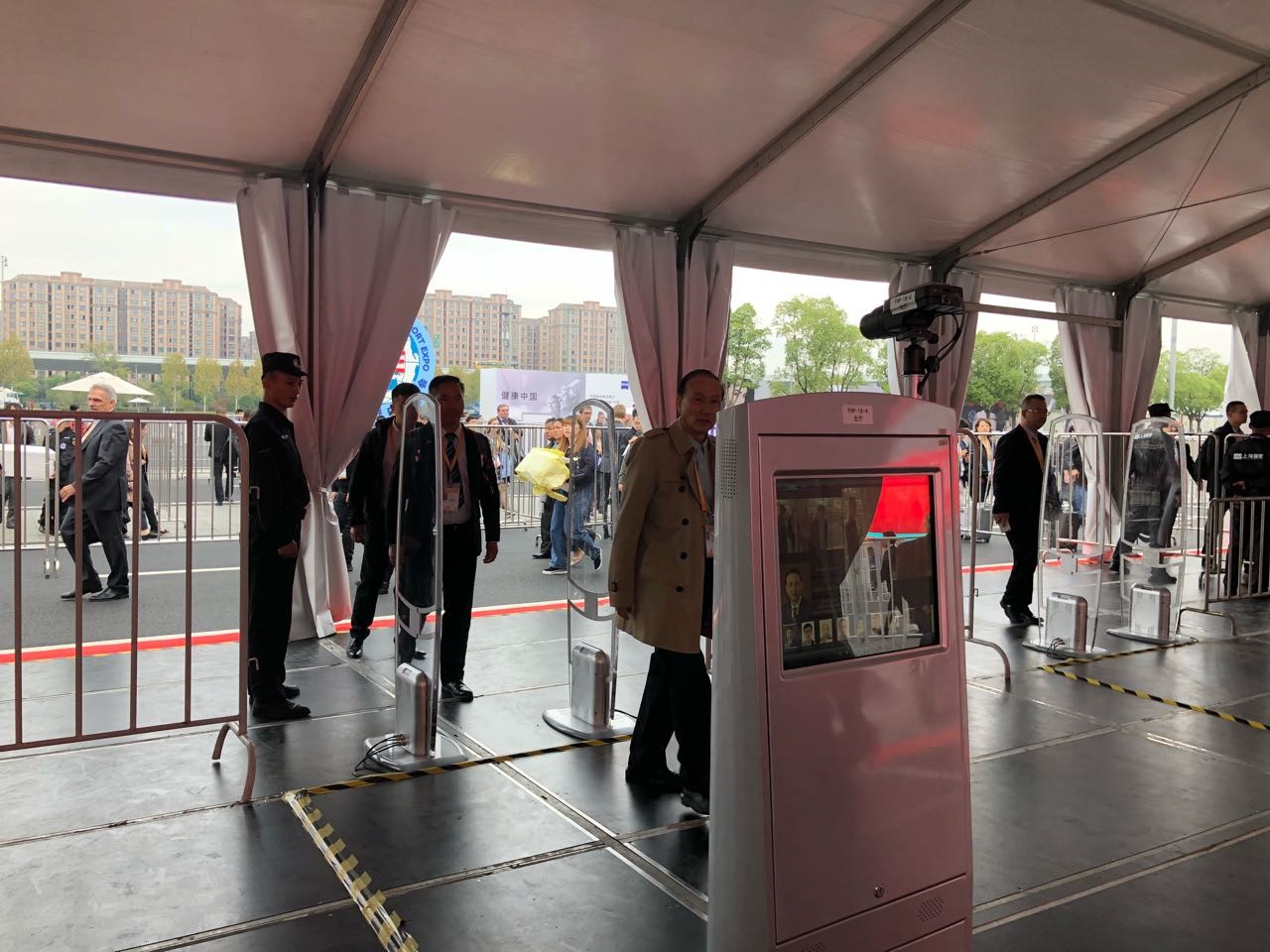 環球網科技記者發現,在主要入口處都有一台“機器人”站崗,當嘉賓從其身邊“刷臉”走過,便可以快速識別身份無感知通行。據瞭解,這個機器人就是由騰訊優圖實驗室團隊為進博會定製的“人臉識別”核身機,在進博會各主要入口一共佈置了110餘台,承擔每天30萬左右次參會人員的核身任務。
