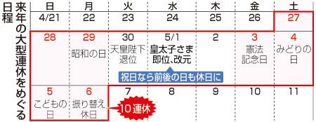 日本法律規定:為避免假日和工作日之間的頻繁轉換,當兩個節日之間夾着一個工作日的時候,該工作日也應被定為法定假日。如果新天皇登基的5月1日變成節日,那麼夾在兩個節日之間的4月30日和5月2日也都成了法定假日。如此一來,在平成年代的尾聲,日本人便可以享受這連續10天的超長假期。
