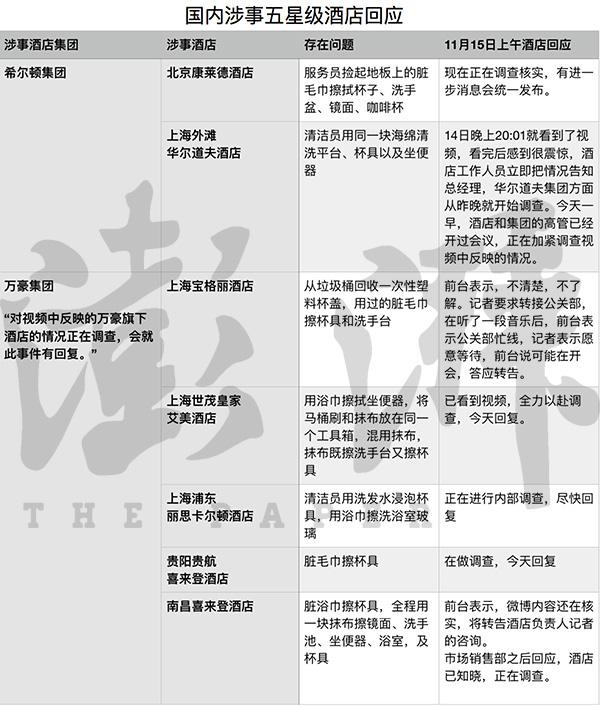 關於11月14日晚間在微博爆出的國內五星級酒店衞生亂象,澎湃新聞採訪了全部涉事的14家酒店。