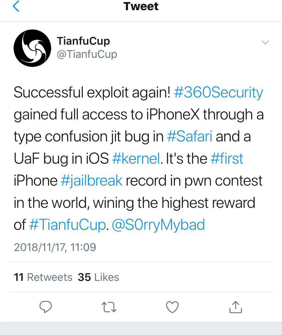 11月17日上午, 360Security戰隊在首屆“天府杯”國際網絡安全大賽上成功破解iPhone X,實現越獄,這是歷史上首次在國際破解比賽上實現iPhone越獄。