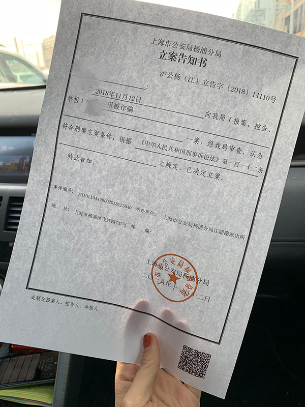 受害人徐女士向記者出示了她和其他上海地區受害人報警後收到的立案告知書,目前,不少上當受騙的上海居民已經前往警方報案,上海警方已經對該案件進行了登記,詐騙公司所在地的深圳警方也已經立案調查。