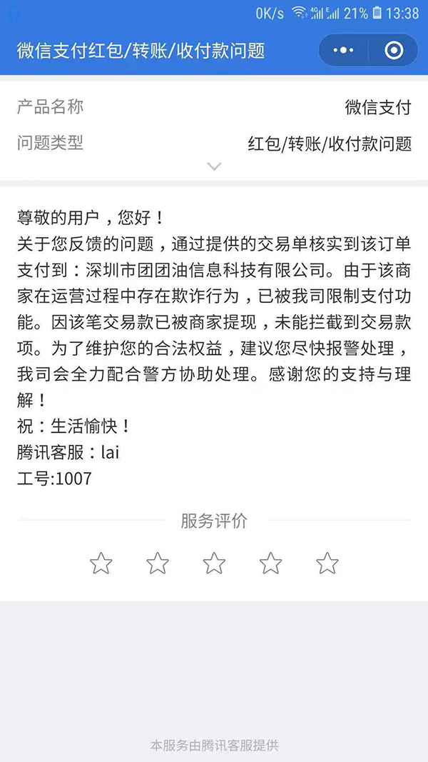 一名受害者收到的投訴回覆顯示:該小程序已經因為涉嫌違規被永久封禁,如有資金損失,建議儘快報警處理,如需我司協助,我司會全力配合公安機關。但是該筆交易款已被商家提現,未能攔截到交易款項。