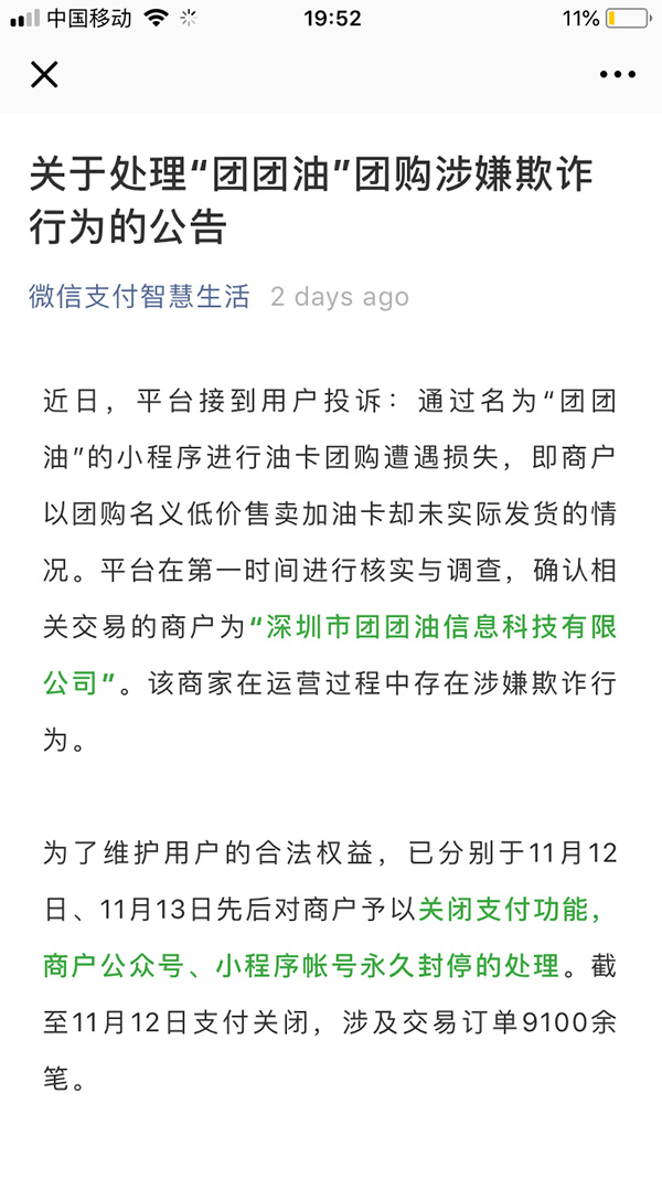 微信平台關於團團油的處理公告? 微信支付智慧生活微信公眾號 截圖