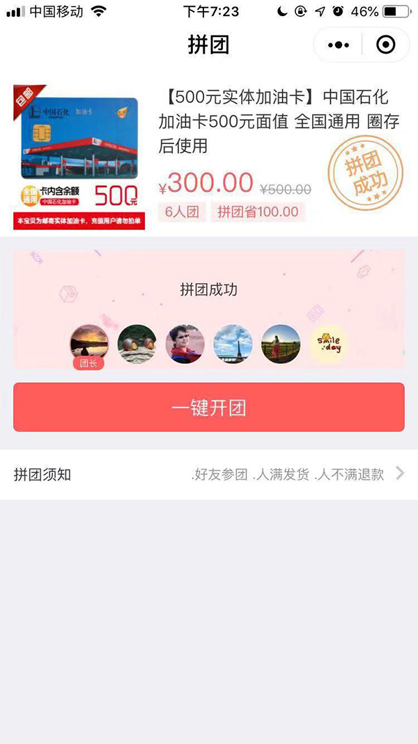 雙十一帶着朋友同事團購了6折的油卡,次日等來的卻不是發貨通知,而是團購平台“失聯”的消息。近日,澎湃新聞記者從多名上海市民處獲悉,微信小程序“團團油”在雙十一期間,推出“打折+拼團”,聲稱單獨購買實體加油卡打7.5折,6人拼團購買油卡打6折,吸引大量消費者下單後,於次日提現並失聯。