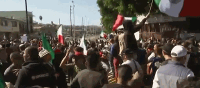 在這個距離美國邊境僅有1.6公里的地方,當地的示威者高唱墨西哥國歌,揮舞墨西哥國旗,喊着“出去!出去!”,逼移民者回家。