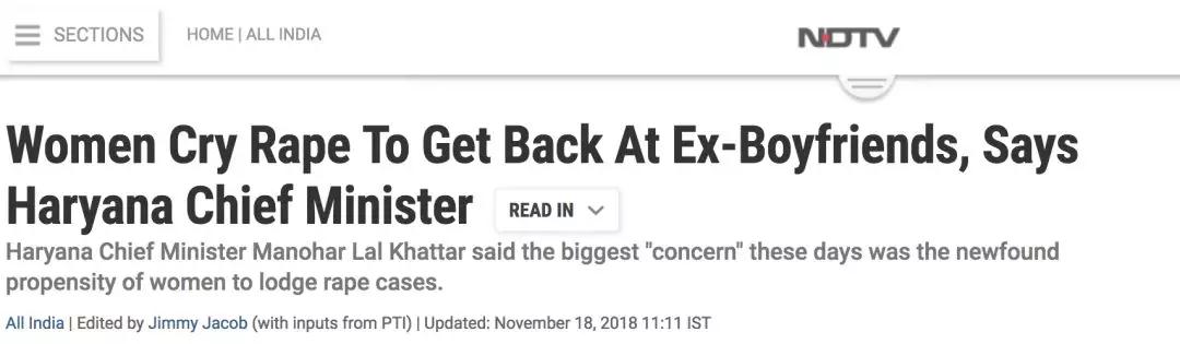據報道,哈塔爾17日出席一場集會活動時,就該邦近年來強姦案不斷增加表示,“強姦不是什麼新鮮事,過去有,現在也有”。緊接着他話鋒一轉,稱這些案件暴露了“大問題”,即女性會自稱被認識的男性強姦,目的就是報復。哈塔爾還搬出數據支持自己的“理論”。他表示,大約80%到90%的強姦和性騷擾案發生在熟人之間,“他們本來混在一起,可哪天要是吵架了,女方就會告男方強姦”。