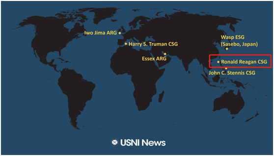 【環球網報道 記者 劉洋】美國“海軍學院新聞”(USNI NEWS)19日依據美國海軍以及公開數據,整理了當日美國航母戰鬥羣及兩棲備戰羣的大致即時位置,其中顯示,有2個美軍航母戰鬥羣正在西太平洋上作業。其中,“里根”號航母戰鬥羣正在南海航行。