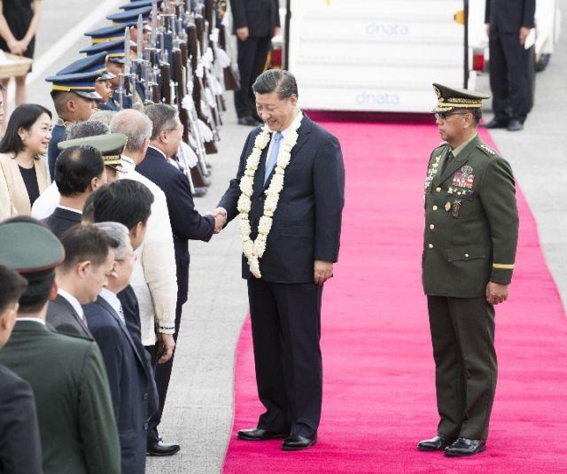 當地時間近午時,習近平步出專機艙門,菲律賓政府高級官員在舷梯旁熱情迎接,軍樂隊奏迎賓曲。習主席代表中國政府和中國人民向菲律賓政府和人民致以誠摯問候和良好祝願。