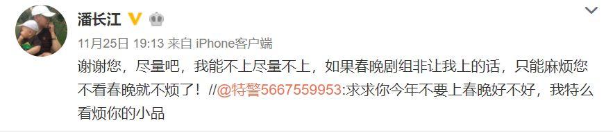 還有人直接在潘長江微博下留言稱“最煩你小品”,潘長江則轉發回應:謝謝您,儘量吧,我能不上儘量不上……