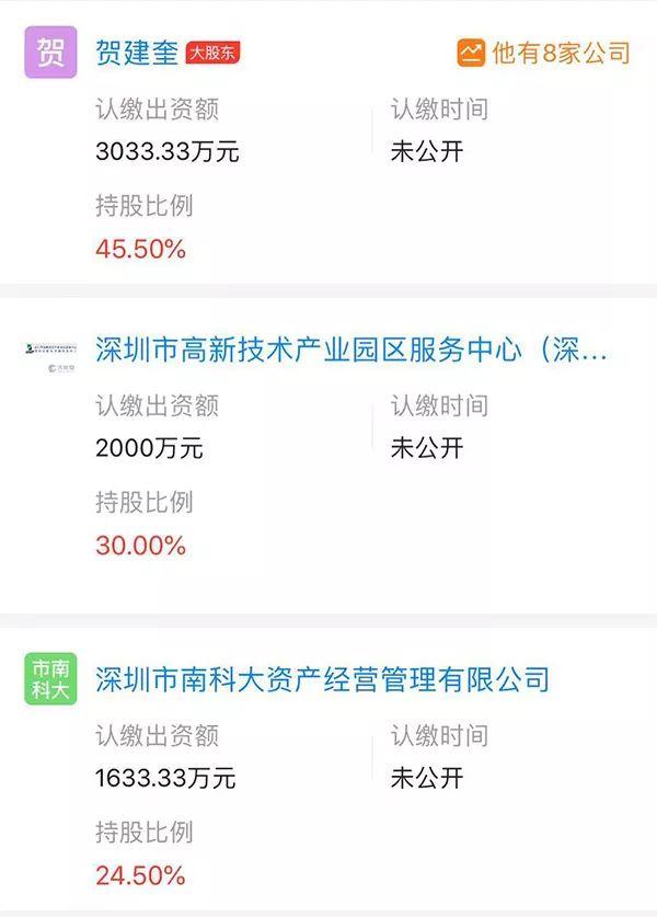 在深圳市南科生命科技有限公司,賀建奎是第一大股東,持股比例45.5%。另外兩大股東分別是深圳市高新技術產業園服務中心,持股30%;深圳市南科大資產經營管理有限公司,持股比例24.5%。南科大資產經營管理有限公司系南方科技大學旗下的全資子公司。