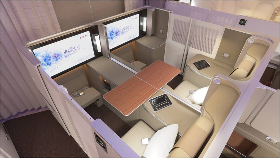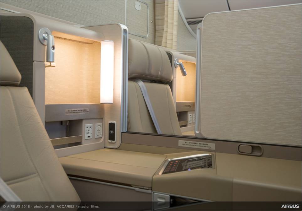 乘飛機旅行,追求的是高端舒適的旅行享受,機上的座位空間尤為重要。A350全新的寬體機身、全新的寬體座椅,極大的優化了個人空間。頭等艙(豪華公務艙)採用1-2-1佈局,座椅均採用全平躺設計;中間兩個座椅可變成支持四個人交流的“社交區域”;每個旅客位置都帶兩扇可移動滑門,關閉後可形成旅客獨立的私密包廂空間,更好的滿足旅客對空間的需求。
