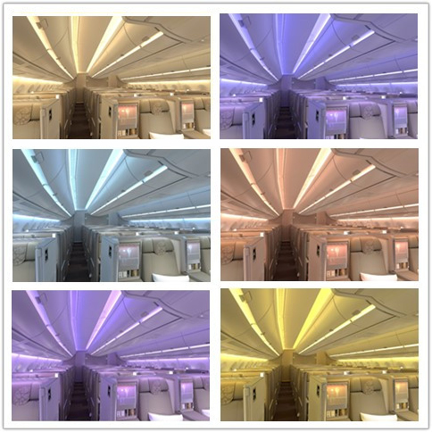 A350全LED座艙情境燈光系統可提供多達1670萬種不同顏色,有無數種組合和場景。同時,優化定義了7 種不同客艙情景燈光,營造出包括日出、巡航、休閒、日落等不同時段的照明場景。並在NIGHTMODE下定義了50%亮度的上述各情景燈光調節。卓越的燈光系統,有效減少了時差對乘客的影響。