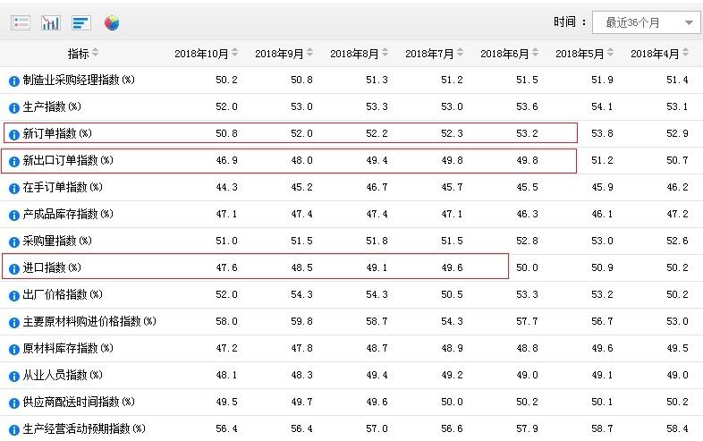 值得注意的是,雖然製造業PMI預期連續28月位於榮枯線上方,但其構成指數中比重最大的新訂單指數已連續5個月回落,其中反映外部需求變化的新出口訂單指數連續5個月低於50%,10月份數據已低於47%,表明下降率加快。同時,進口指數連降5個月,其中4個月低於50%。 (中新經緯APP)