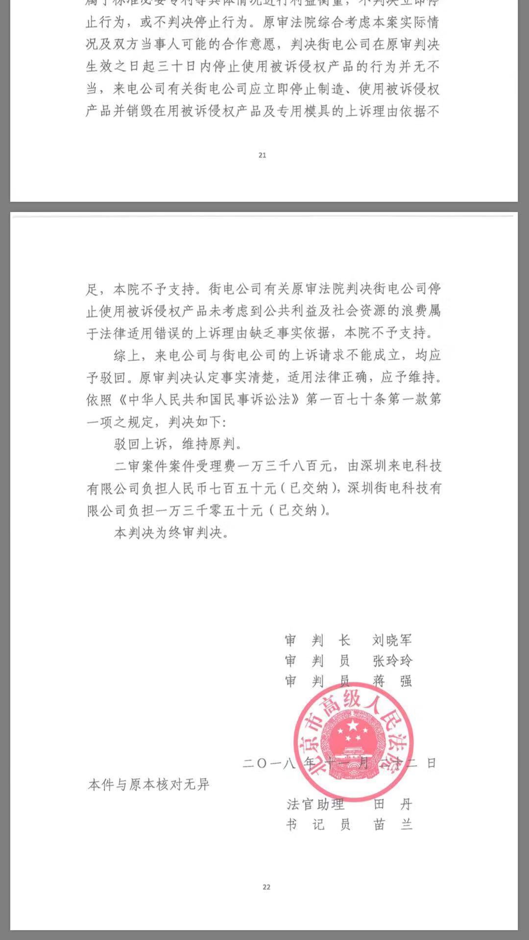 在終審中,根據查明的事實,被告街電公司已經大範圍使用其製造的被控侵權產品,日訂單和用户數量亦較大。考慮涉案專利類型及其在被告街電公司營業利潤中所佔比例等因素,街電公司仍應就涉案侵權行為承擔較大金額的經濟賠償。