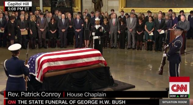 下午5時許,老布什的靈柩送抵美國國會大廈,正式追悼儀式就此拉開序幕。一支軍事儀仗隊將前總統的靈柩抬入圓形大廳,將之安置在1865年為亞伯拉罕·林肯總統的棺材建造的靈柩台上。美國曆史上,只有33名逝者的遺體擺放在國會大廈圓形大廳內供人們瞻仰,包括從一戰到越戰期間的11位總統和不知名士兵。最後一次舉行瞻仰活動是在今年8月,亞利桑那州參議員麥凱恩享此殊榮。