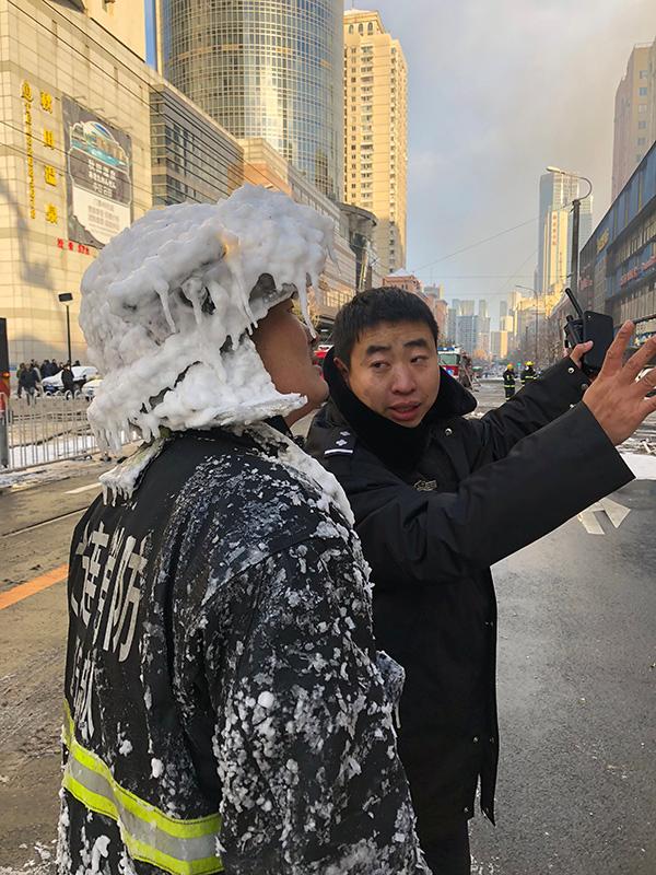 *嶽永峯:*其實我並沒有注意到自己身上已經結冰了,滅火下來之後,隊友跟我説“你看你頭上是什麼樣的”,我才知道。可能是因為扛着水槍,水流到身上,因為天氣很冷就結冰了。