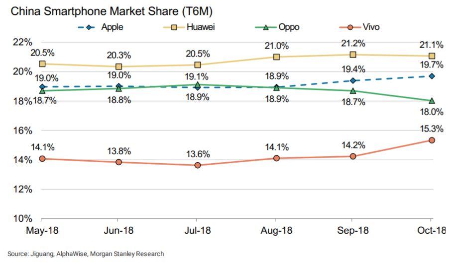 摩根史丹利的研報顯示,受益於9月三款新機的上市,蘋果手機在中國智能手機的市場份額有所提升,並超越OPPO,但仍低於華為。