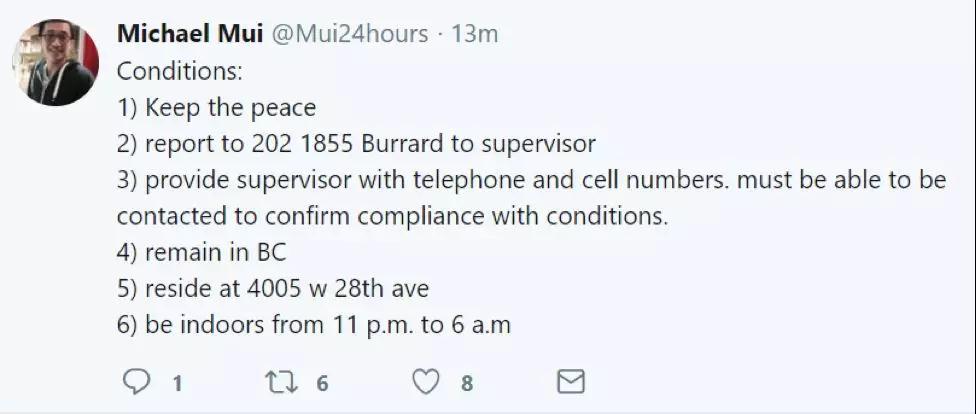 據加拿大《多倫多星報》記者的庭審直播記錄,保釋期間,孟晚舟必須遵守以下16項條件: