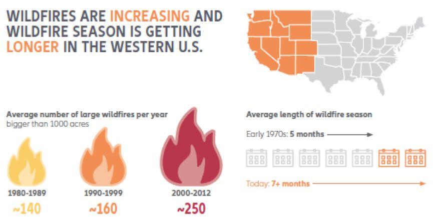 2016年的一項研究表明,氣候變化造成了1979年至2015年55%的美國西部森林乾旱。根據今年8月加州政府發佈的《加利福尼亞州第四次氣候變化評估》,如果温室氣體仍以目前狀態累積,那麼到2100年,加州每年山火覆蓋面積會增加77%。