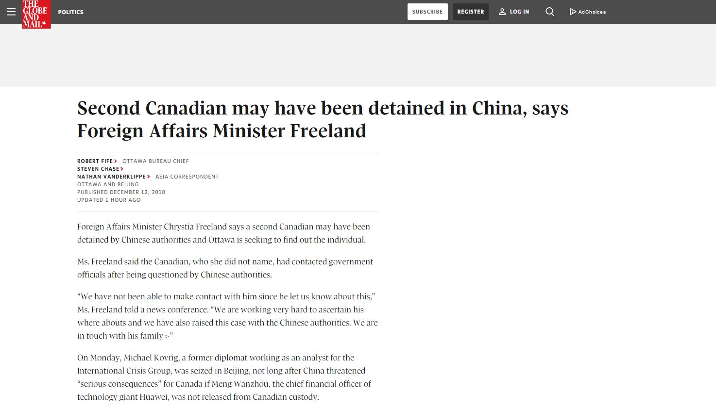 加拿大外交部長克里斯蒂亞•弗裏蘭在12日下午召開的一場新聞發佈會上表示,繼康明凱於12月10日被拘後,有另一名公民也已與加拿大官員聯繫,稱其“受到了中國政府的詢問”。