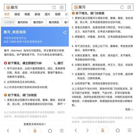 基於“就醫指南”,當用户身體出現不適症狀時,只需在搜狗搜索中輸入症狀名稱,搜索結果頁首條即會展現關於該症狀的“就醫指南”。如,腹瀉是一種較為常見的病症,但造成腹瀉的原因複雜多樣,其嚴重程度也各不相同,患者如果突然出現腹瀉該如何應對?“腹瀉”的“就醫指南”便向患者提醒道,當患者的腹瀉症狀表現為“突然出現急性水樣便、肌肉絞痛、心動過速”等情況時,應立即撥打120。而如果腹瀉的症狀表現為“反覆出現,與便秘交替,伴隨腹痛、腹脹、食慾減退、噁心等症狀”等6種情況時,則須及時去門診就醫諮詢。