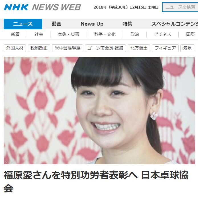 NHK稱,福原愛不僅人氣高,實力也很強。她作為日本頂尖的乒乓球選手常年引領日本乒乓球界,許多小孩都因為崇拜福原愛而開始打乒乓球,為日本乒乓球的普及和實力的提高做出了重大貢獻。因此,日本乒乓球協會決定授予其“特別功勞者表彰”。
