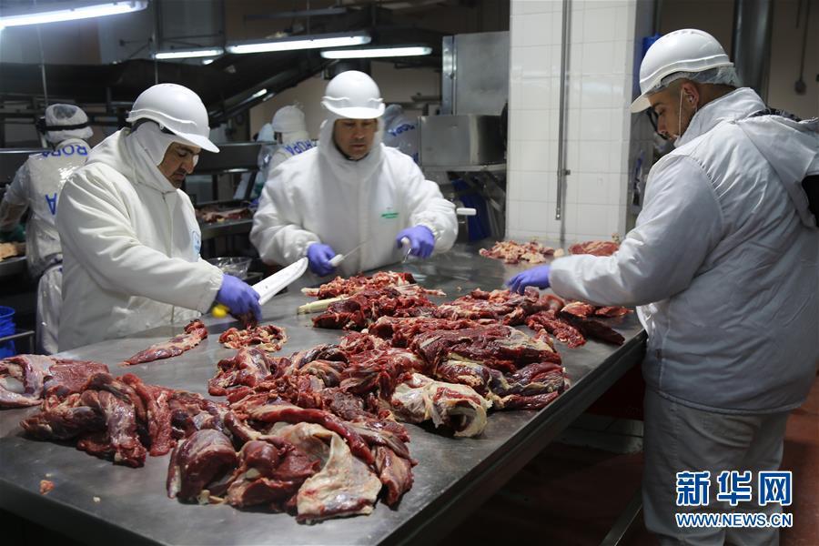 在阿根廷休斯,牛肉加工廠工人在分割牛肉(6月12日攝)。這家工廠是中國企業新大洲的戰略合作伙伴,每天屠宰500至700頭牛,牛肉主要出口到中國。 新華社記者 倪瑞捷 攝