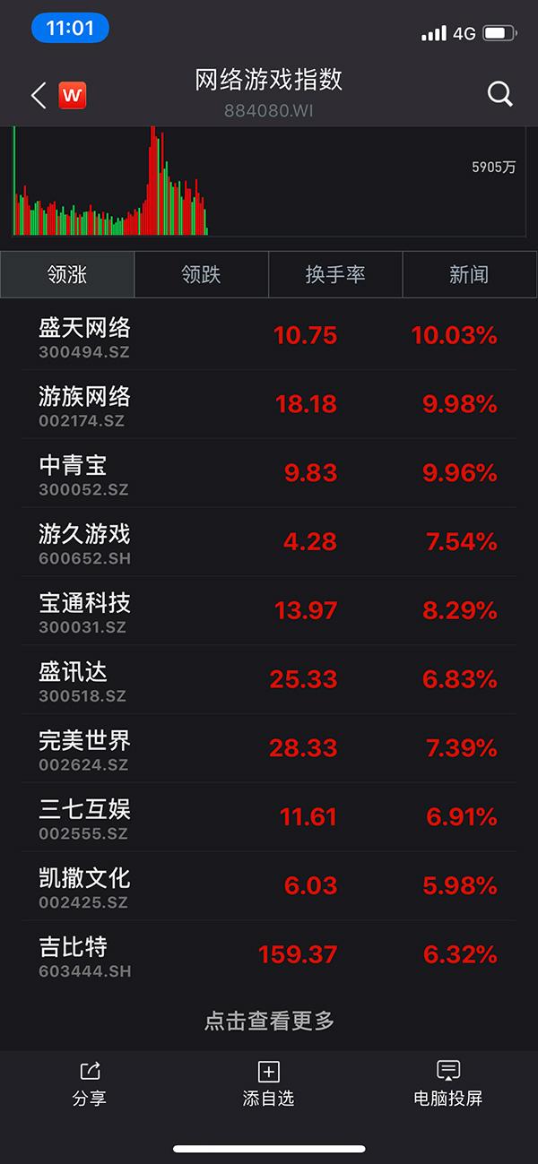 受此消息影響,截至上午10時52分,遊族網絡(002174)漲停,完美世界漲6.9%,遊久遊戲漲超過9%,掌趣科技漲4%,順網科技漲3.67%。在港股上市的騰訊(0700.HK)翻紅漲3.05%。