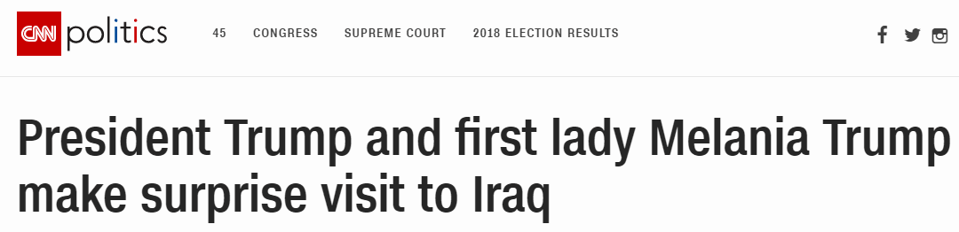 CNN稱,當地的危險局勢仍然制約着特朗普前往伊拉克探望美軍。特朗普攜夫人從華盛頓秘密乘機進行通宵飛行後,降落在一個漆黑的簡易機場。他們在當地停留了約3個小時,並在充滿節日氣氛裝飾的餐廳裏與熱情的士兵們合影。特朗普身着黑色大衣,繫着紅色領帶,其夫人梅拉尼亞則身穿芥末色襯衫,站在他身旁微笑着。