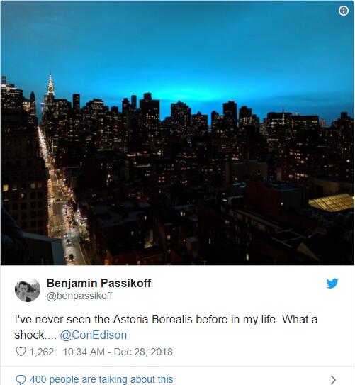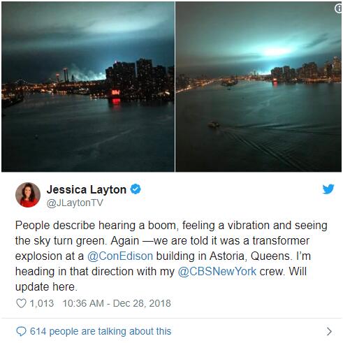 報道稱,愛迪生聯合能源公司發生了明顯的變壓器爆炸,美國政府派遣緊急救援人員趕往現場。距離現場幾英里外的阿斯托里亞上空可以看到霓虹藍色的條紋,許多人迅速在網上發佈了異常閃耀的照片。