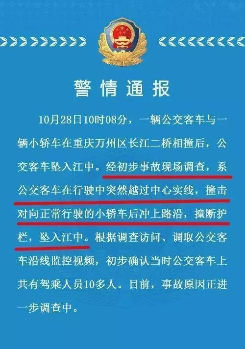 *反轉:*重慶市公安局發佈的警情通報顯示,“經初步事故現場調查,系公交客車在行駛中突然越過中心實線,撞擊對向正常行駛的小轎車後衝上路沿,撞斷護欄,墜入江中。”