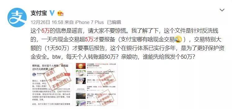 *反轉:*支付寶12月26日進行了闢謠。支付寶表示:這個“支付寶、微信支付賬户5萬元以上的大額交易要上報了”的信息是謠言!
