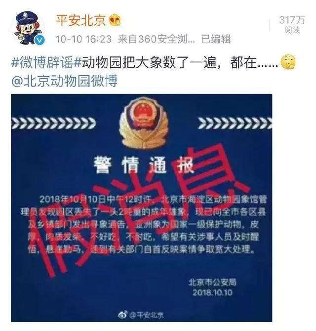 *假消息:*2018年10月10日下午,一張像模像樣的“警情通報”圖在網上廣為傳播。“通報”稱,北京海淀區動物園象館管理員發現園區丟失一頭2噸重的成年雄象,並且“貼心”提示:大象肉質柴,不好吃,希望涉事人員懸崖勒馬……