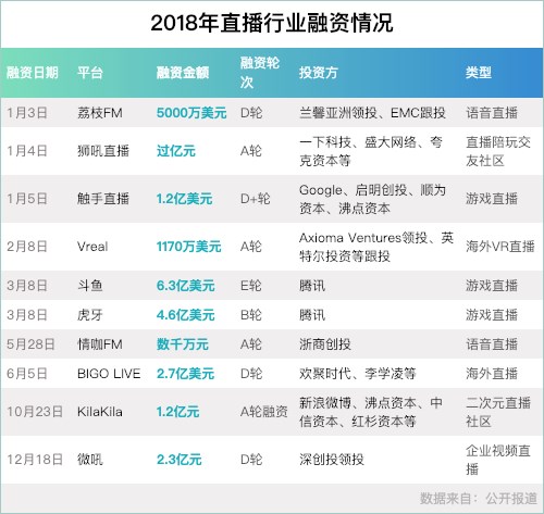 在融資金額方面,2018年全年的融資額與去年上半年相當,都在百億元的體量。但今年的融資門檻進一步提高,幾乎每起融資金額都在億元級別,虎牙和鬥魚的融資總額近11億美金,頭部效應凸顯。