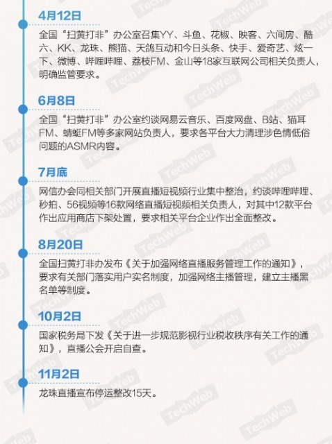 8月,全國掃黃打非辦發佈《關於加強網絡直播服務管理工作的通知》,要求有關部門落實用户實名制度,加強網絡主播管理,建立主播黑名單等制度。