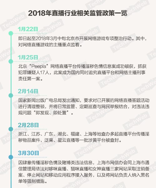 進入3、4月份,監管部門對直播涉黃問題進行集中整治,泛果、星雲直播等一批涉黃平台被查封,哆咪直播、貓咪直播和女神直播三家網站被註銷,YY、鬥魚、花椒、映客等18家直播、短視頻企業被召集開會,要求加強內容安全管理。