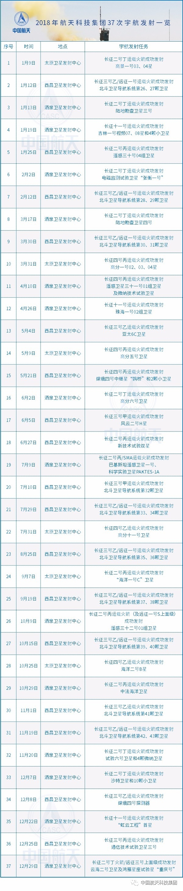 至此,2018年中國航天發射圓滿收官,累計完成39次,除首枚民營火箭藍箭空間朱雀一號之外全部取得成功,同時首次超越美國,位列全球第一。