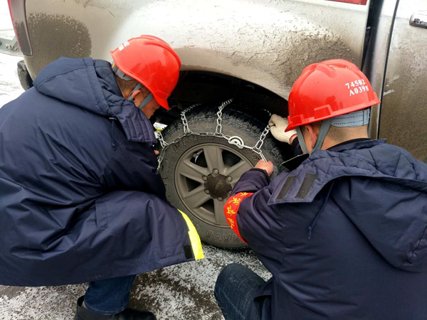 習水供電局黨員服務隊為搶修車裝上防滑鏈