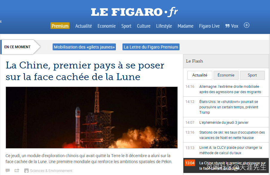 2)法國的《費加羅報》,最著名的當屬那句“若批評不自由,則讚美無意義”,也是本人接觸比較早的法國媒體,自己閲讀的經歷來看,國內新聞上頭條也不是不可能的事情,但是不算多,感覺選取的標準其實也很明確,負面的大事件。不過這次的標題還是比較給面子“中國,首個着陸月之暗面的國家”,內容簡短客觀,也提到了着陸月背的困難之處。