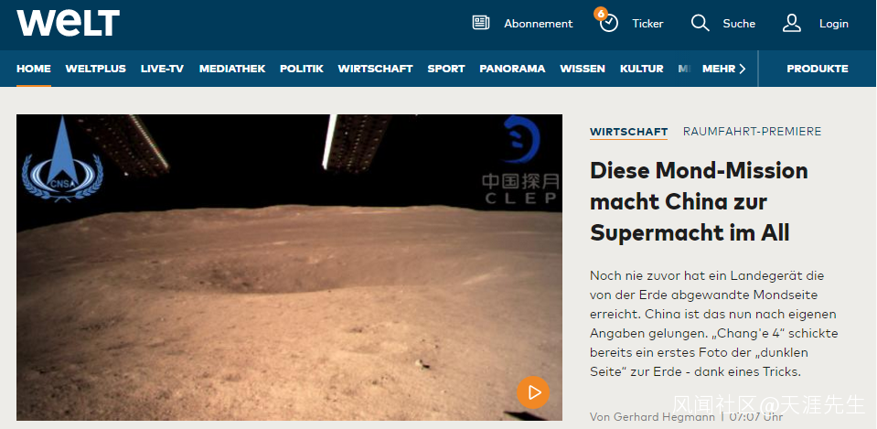 3)德國《世界報》這份報紙本人看的不多,一般看《明鏡在線》(Spiegel Online),個人的感覺是國內新聞上德國媒體頭條也不太容易,當然平時看德媒不算多,一般是因為有什麼想了解的話題才去看一下,個人印象中頭條的時候是菲律賓訴南海問題仲裁出結果的當天,西方媒體鋪天蓋地的頭條,德媒也是湊了熱鬧。這次,題為“月球任務使中國成為太空超級大國”的頭條表明《世界報》再一次感興趣了,因為中國成為首個成功着陸月背的國家,因為2018年中國以39次火箭發射力壓美(31次)俄(20次),去年共發射了114次火箭,中美俄佔了90次,報道也不忘感慨老歐洲(8次)僅比三哥多一次(7)。
