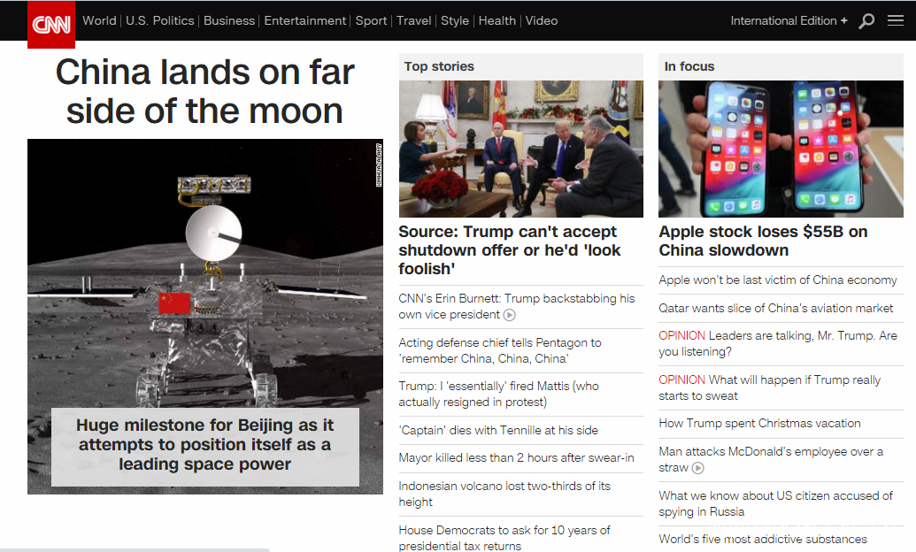 1)CNN是中國讀者的“老朋友”了,是本人看到最早掛上頭條的,題目平淡無奇“中國着陸月球背面”,副標題就很有意思了“巨大的里程碑,中國欲成太空領袖”,文章內容也大致看了一下,在上午的基礎上做了更改,上午的基調還在酸國內媒體發嫦娥4成功着陸後又迅速刪除的梗,諷刺究竟是成功着陸了還是因為出現問題了。待央視播報後,基調才轉變,大幅援引了央視的新聞內容,隨後又簡要介紹了中國的太空項目,最後感嘆美國自家太空項目預算缺乏,指責中國太空項目威脅美國安全。
