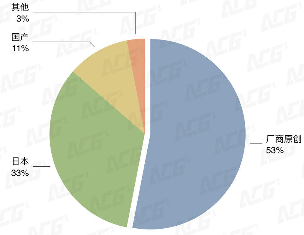 在2018年正常運營的132款二次元遊戲中,有53%的產品都是由遊戲廠商自己原創,與之相對的,則是國產IP佔比的進一步縮小,僅佔市場總量的11%。