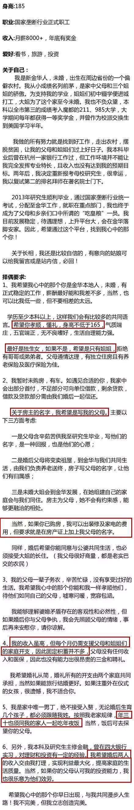 **劃重點:**男,30歲,985高校畢業,國企工作,月入8000。要求找一個高學歷、身高≥165、收入相當的本地女孩,合夥買房(或者女方有房)必須加上自己爸媽名字、必須與他的父母同住、大姐會經常來住,必須笑臉相迎、女方家境要好,不能有兄弟姐妹,要保證生兒子…