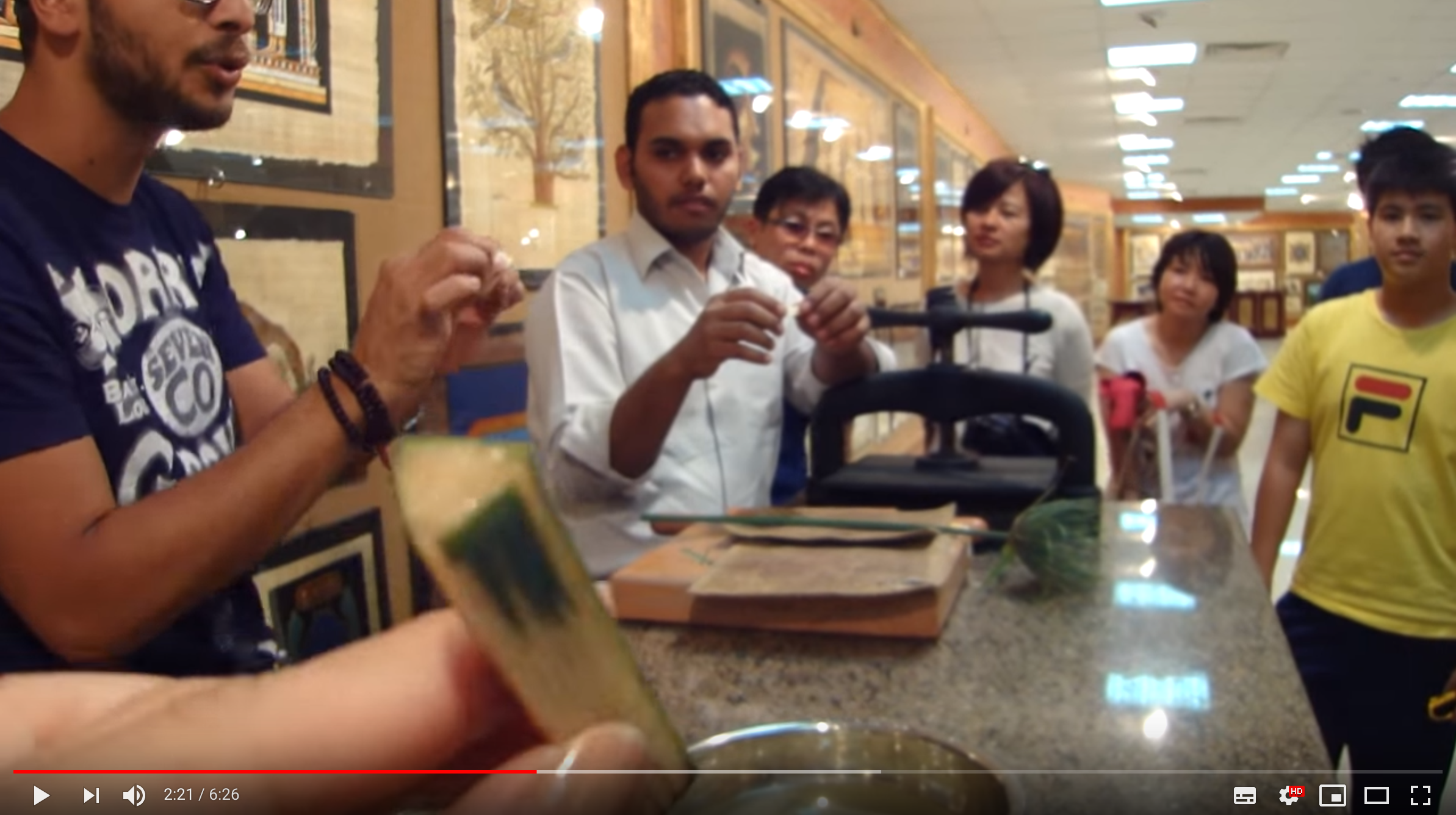 這裏小哥講解如何分辨是真的還是假的莎草紙,把莎草紙浸入水中是不會化開的。