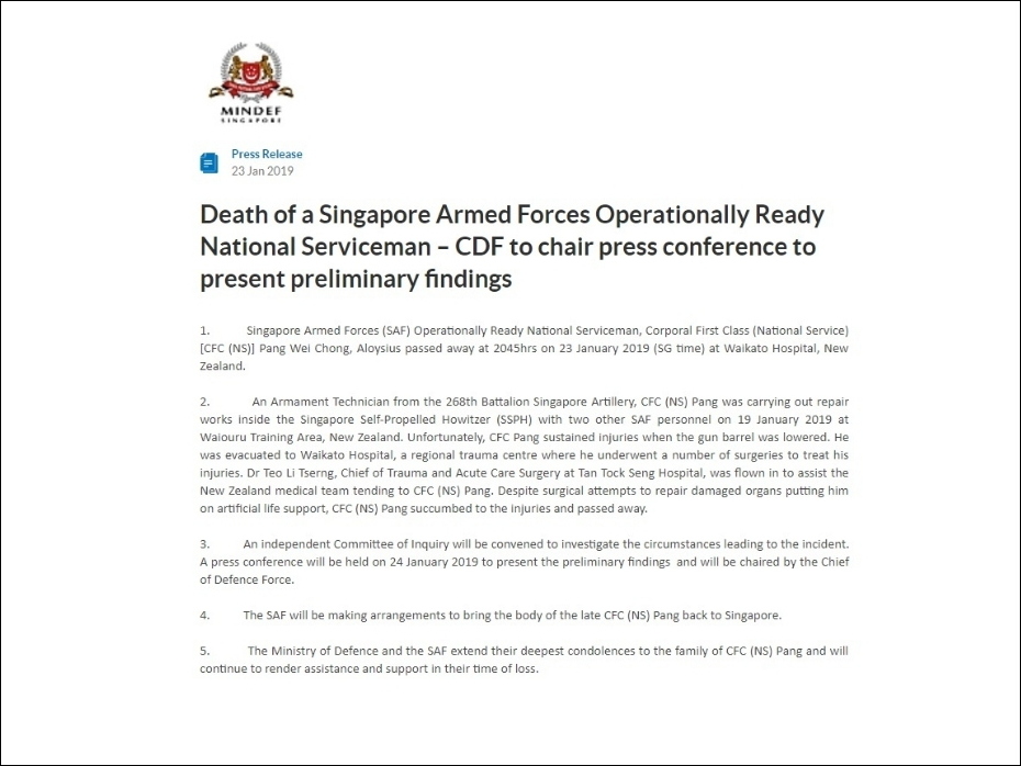 23日晚,新加坡國防部發表文告證實了上述消息。文告指出,在新西蘭受訓時重傷的28歲戰備軍人馮偉衷一等中士,於北京時間23日晚上8點45分,在新西蘭懷卡託醫院(Waikato)宣告不治。